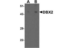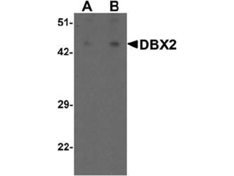 DBX2 is a member of the developing brain homeobox (DBX) protein family, but while the related protein DBX1 is expressed in various regions of the developing brain, DBX2 shows a more restricted pattern of expression in the brain, and is also expressed in some mesenchymal cells such as limb buds and tooth germs. It is thought that DBX1 and DBX2 promote the development of a subset of interneurons, some of which help mediate left-right coordination of locomotor activity. In Xenopus, DBX2 is involved in primary neurogenesis and early neural plate patterning, and is thought to act as a cross-repressive partner of NKX6-2 in the patterning of the ventral neural tube.Synonyms: DBX-2, Developing brain homeobox 2, Homeobox protein DBX2