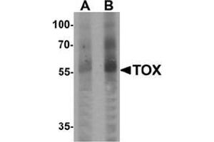 TOX (thymocyte selection-associated high mobility group (HMG) box protein) is a member of the HMG box family of DNA-binding proteins and likely plays a role in the regulation of T-cell development (1,2). It is a 526 amino acid nuclear protein and the expression of TOX is upregulated by pre-T cell receptor (pre-TCR) and TCR activation in immature thymocytes. TOX-mediated positive selection is associated with up-regulation of RUNX3 and is calcineurin dependent. TOX-dependent transition to the CD4+CD8 stage is required for development of class II major histocompatibility complex-specific T cells.Synonyms: KIAA0808, Thymocyte selection-associated high mobility group box protein TOX, Thymus high mobility group box protein TOX