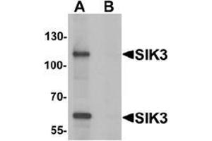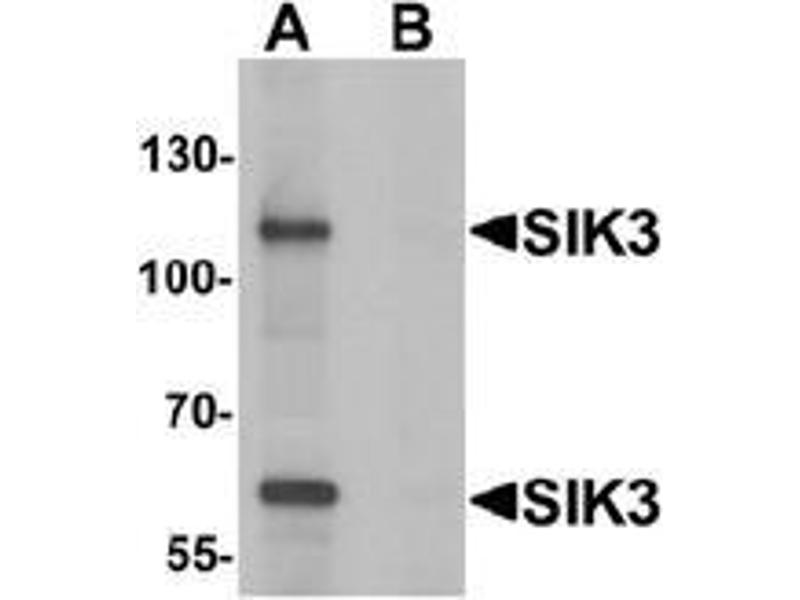 Salt-inducible kinase family (SIKs) proteins are thought to have a role in steroidogenesis, adipogenesis or regulation of tumor malignancy. Three members (SIK1, SIK2 and SIK3) in the SIK family have been identified thus far. Their kinase domain sequences are closely homologous to those of AMP-activated protein kinase (AMPK). SIK3 can be phosphorylated by a tumor-suppressor kinase LKB1. It is highly and preferentially expressed in ovarian tumors but not in adenomyosis and leiomyoma and may be a potential diagnostic marker for ovarian cancers.Synonyms: EC=2.7.11.1, KIAA0999, QSK, SIK-3, SIK3, Salt-inducible kinase 3, Serine/threonine-protein kinase QSK