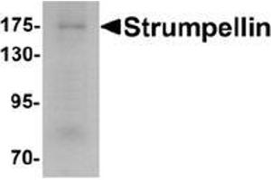 Strumpellin is a ubiquitously expressed, multi-transmembrane and spectrin-repeat-containing protein. It is named for Strumpell disease, a progressive upper-motor neurodegenerative disease termed hereditary spastic paraplegia (HSP). The Strumpellin gene maps to the eighth HSP locus (SPG8) on chromosome 8p24.13. Three families liked to this locus have mutations in the Strumpellin gene, rescue studies of zebrafish with decreased Strumpellin expression with Strumpellin mRNA containing these mutations showed impaired normal function of this protein. Recent studies suggest that Strumpellin may also be involved in protein aggregation diseases.Synonyms: KIAA0196
