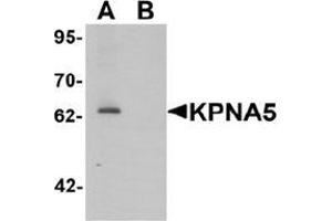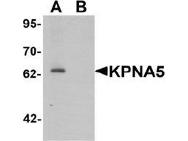Karyopherin, a cytosolic and heterodimeric protein complex consisting of alpha and beta subunits, is responsible for targeting proteins with nuclear localization signals to the nuclear pore complex (NPC) by an energy requiring, Ran-dependent mechanism. The alpha subunit and imported substrate enter the nucleus and accumulate in the nucleoplasm, while the beta subunit accumulates at the NPC. KPNA5 belongs to a subfamily within the KPNA family that also includes KPNA4 and 6 and is thought to be involved in NLS-dependent protein imort into the nucleus.Synonyms: Karyopherin subunit alpha-5
