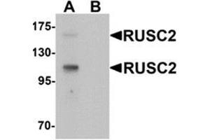 RUSC2, also known as Iporin, shares with the related protein RUSC1 a common domain structure of RUN, leucine zipper and SH3 domain in addition to over 30 % amino acid identity. RUSC2 is a rab1-interacting protein that also interacts with GM130, another rab1-interacting protein. RUSC2 interacts with specific rab1 isoforms with different rab-binding specificity. It has been suggested that RUSC2 may function as a link between the targeting of ER derived vesicles triggered by the rab1 GTPase and a signaling pathway composed of proteins containing SH3 and/or poly-proline regions.Synonyms: Iporin, RUN and SH3 domain containing protein 2