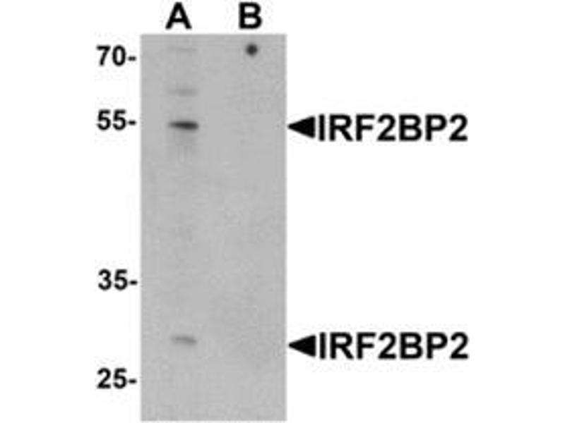 IRF2BP2, like the related protein IRF2BP1, is a co-repressor that interacts specifically with the C-terminal repression domain of Interferon Regulatory Factor 2 (IRF2). IRF2BP2 is a direct target gene of p53 and is involved in cell survival during the p53 stress response, able to impede the p53-mediated transactivation of p21 and Bax. IRF2BP2 is also a co-factor of VGLL4 and is required to induce the expression of vascular endothelial growth factor A (VEGF-A) in muscle. It is normally found in the nucleus of skeletal muscle and cardiac cells, but can be found in the cytoplasm during skeletal muscle differentiation.Synonyms: IRF-2-binding protein 2, IRF-2BP2, Interferon regulatory factor 2-binding protein 2