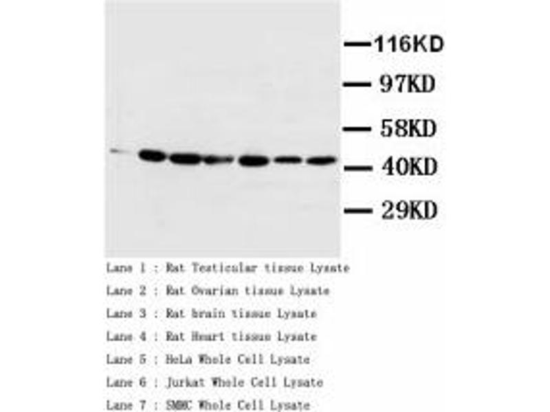 Synthetic peptide corresponding to a sequence at the C-terminal of human Actin (367-377aa), identical to the related rat sequence.