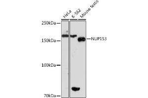 Nuclear pore complexes regulate the transport of macromolecules between the nucleus and cytoplasm. They are composed of at least 100 different polypeptide subunits, many of which belong to the nucleoporin family. Nucleoporins are glycoproteins found in nuclear pores and contain characteristic pentapeptide XFXFG repeats as well as O-linked N-acetylglucosamine residues oriented towards the cytoplasm. The protein encoded by this gene has three distinct domains: a N-terminal region containing a pore targeting and an RNA-binding domain domain, a central region containing multiple zinc finger motifs, and a C-terminal region containing multiple XFXFG repeats. Alternative splicing results in multiple transcript variants of this gene. [provided by RefSeq, May 2013],HNUP153, N153,Epigenetics & Nuclear Signaling,Nuclear Receptor Signaling,Signal Transduction,NUP153