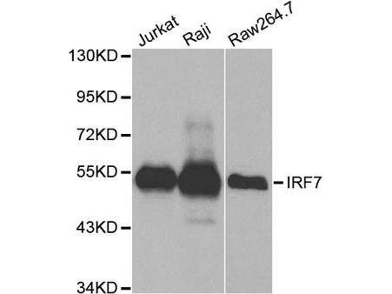 IRF7 encodes interferon regulatory factor 7, a member of the interferon regulatory transcription factor (IRF) family. IRF7 has been shown to play a role in the transcriptional activation of virus-inducible cellular genes, including interferon beta chain genes. Inducible expression of IRF7 is largely restricted to lymphoid tissue. Multiple IRF7 transcript variants have been identified, although the functional consequences of these have not yet been established.,IRF7,IMD39,IRF-7H,IRF7A,IRF7B,IRF7C,IRF7H,Epigenetics & Nuclear Signaling,Transcription Factors,Immunology & Inflammation,Cytokines,Interferons,Toll-like Receptor Signaling Pathway,Cell Intrinsic Innate Immunity Signaling Pathway,TLR Signaling,IRF7