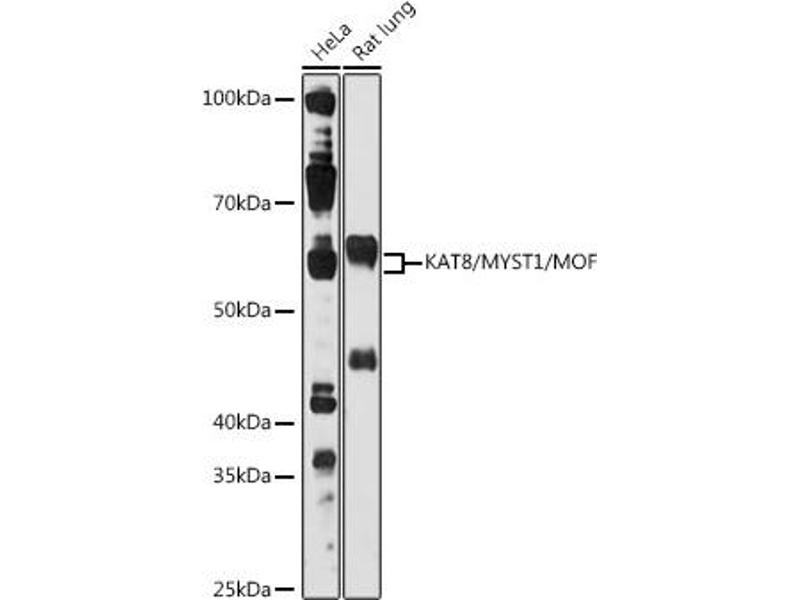 This gene encodes a member of the MYST histone acetylase protein family. The encoded protein has a characteristic MYST domain containing an acetyl-CoA-binding site, a chromodomain typical of proteins which bind histones, and a C2HC-type zinc finger. Multiple transcript variants encoding different isoforms have been found for this gene.,KAT8,MOF,MYST1,ZC2HC8,hMOF,Epigenetics & Nuclear Signaling,Chromatin Modifying Enzymes,Acetylation,KAT8