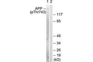 Amyloid beta A4 (Phospho-Thr743/668) Antibody detects endogenous levels of Amyloid beta A4 only when phosphorylated at Thr743/668.