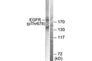 EGFR (Phospho-Thr678) Antibody detects endogenous levels of EGFR only when phosphorylated at Thr678.