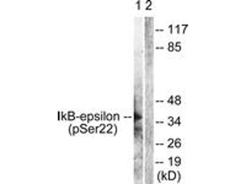 IkappaB-epsilon (Phospho-Ser22) Antibody detects endogenous levels of IkappaB-epsilon only when phosphorylated at Ser22.