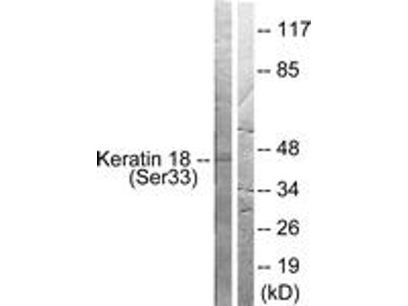 Keratin 18 (Phospho-Ser33) Antibody detects endogenous levels of Keratin 18 only when phosphorylated at Ser33.