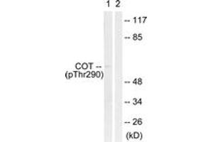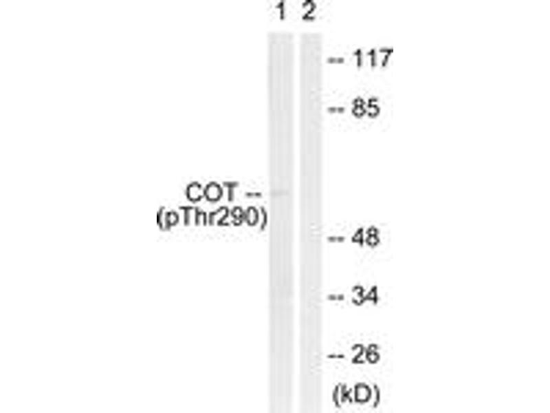 COT (Phospho-Thr290) Antibody detects endogenous levels of COT only when phosphorylated at Thr290.