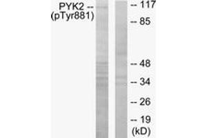 PYK2 (Phospho-Tyr881) Antibody detects endogenous levels of PYK2 only when phosphorylated at Tyr881.
