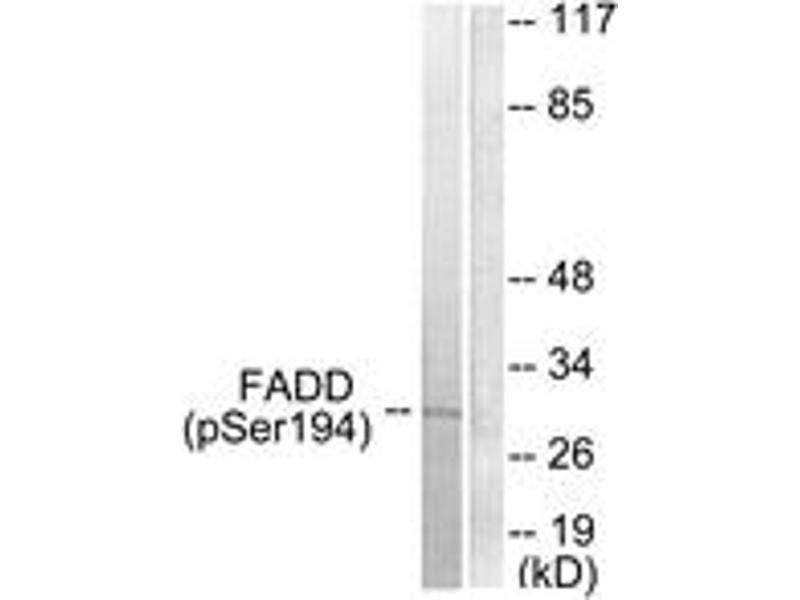 FADD (Phospho-Ser194) Antibody detects endogenous levels of FADD only when phosphorylated at Ser194.