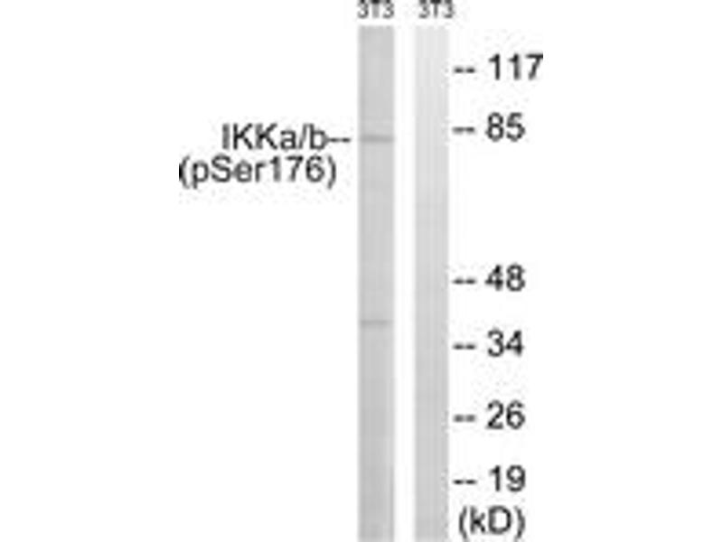 IKK-alpha (Phospho-Ser176) /IKK-beta (Phospho-Ser177) Antibody detects endogenous levels of IKK-alpha only when phosphorylated at Ser177.
