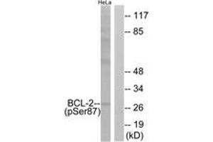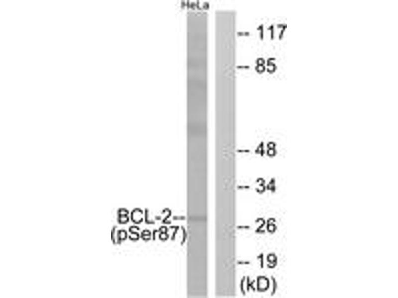 BCL-2 (Phospho-Ser87) Antibody detects endogenous levels of BCL-2 only when phosphorylated at Ser87.