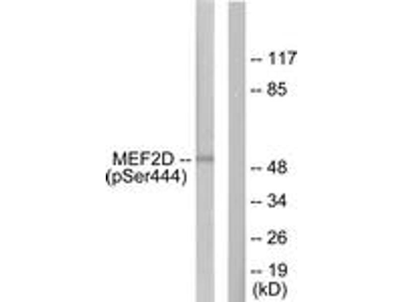 MEF2D (Phospho-Ser444) Antibody detects endogenous levels of MEF2D only when phosphorylated at Ser444.