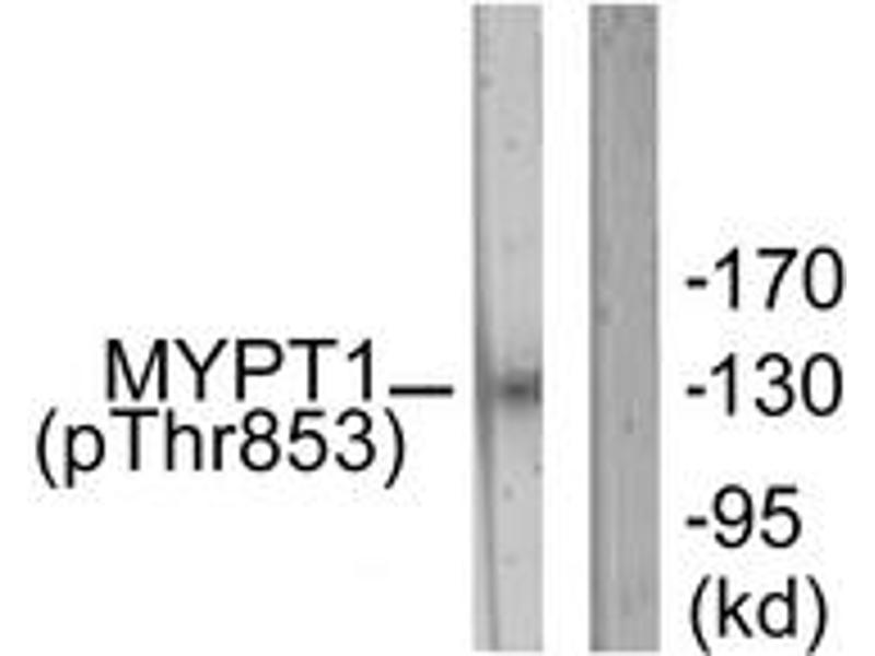 MYPT1 (Phospho-Thr853) Antibody detects endogenous levels of MYPT1 only when phosphorylated at Thr853.
