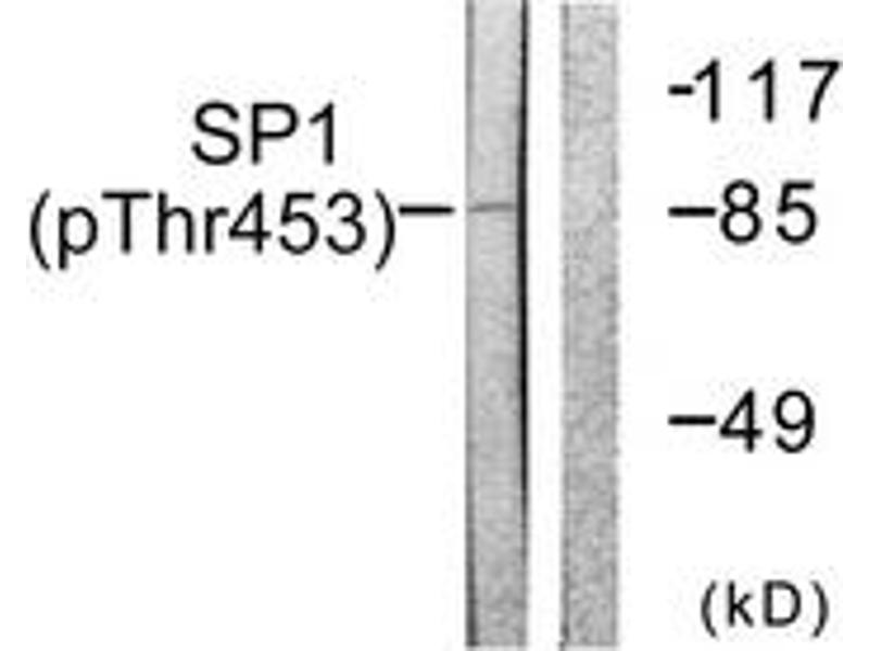 SP1 (Phospho-Thr453) Antibody detects endogenous levels of SP1 only when phosphorylated at Thr453.