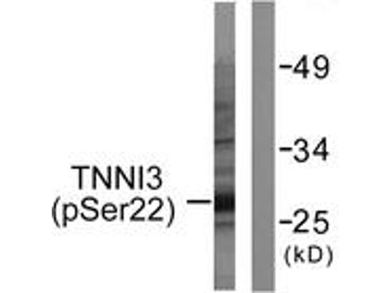 TNNI3 (Phospho-Ser22+Ser23) Antibody detects endogenous levels of TNNI3 only when phosphorylated at Ser22 and Ser23.