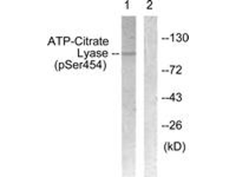 ATP-Citrate Lyase (Phospho-Ser454) Antibody detects endogenous levels of ATP-Citrate Lyase only when phosphorylated at Ser454.