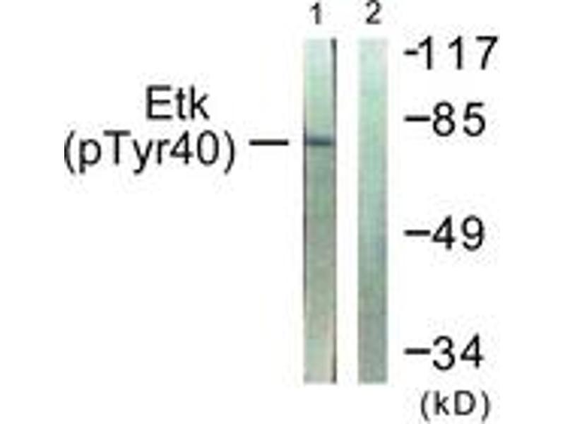 ETK (Phospho-Tyr40) Antibody detects endogenous levels of ETK only when phosphorylated at Tyr40.