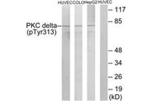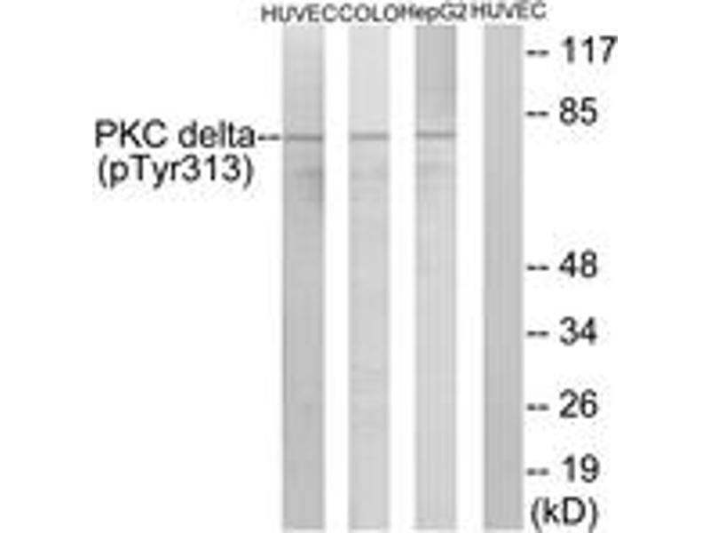 PKC delta (Phospho-Tyr313) Antibody detects endogenous levels of PKC delta only when phosphorylated at Tyr313.