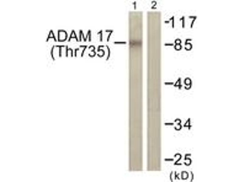 ADAM 17 (Phospho-Thr735) Antibody detects endogenous levels of ADAM 17 only when phosphorylated at Thr735.