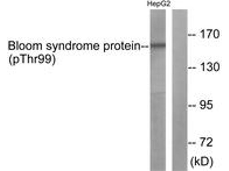 Bloom Syndrome (Phospho-Thr99) Antibody detects endogenous levels of Bloom Syndrome only when phosphorylated at Thr99.