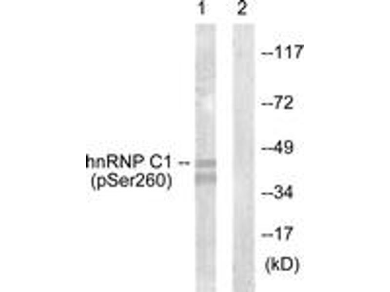hnRNP C1/2 (Phospho-Ser260) Antibody detects endogenous levels of hnRNP C1/2 only when phosphorylated at Ser260.