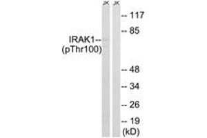 IRAK1 (Phospho-Thr100) Antibody detects endogenous levels of IRAK1 only when phosphorylated at Thr100.