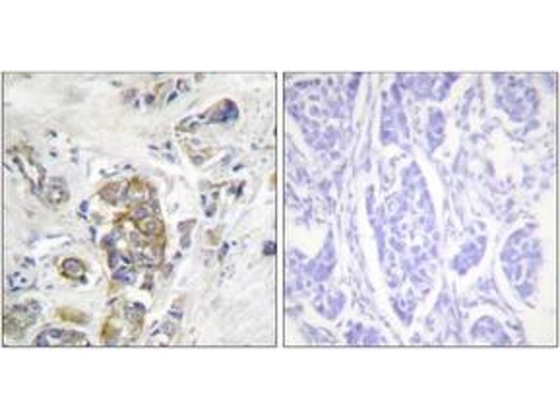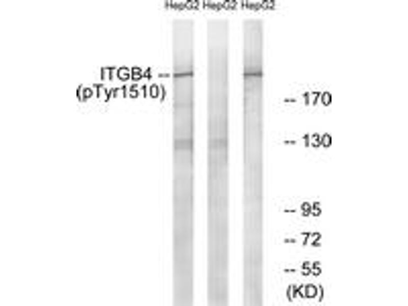 ITGB4 (Phospho-Tyr1510) Antibody detects endogenous levels of ITGB4 only when phosphorylated at Tyr1510.