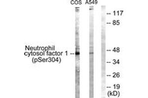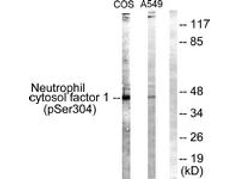 Neutrophil Cytosol Factor 1 (Phospho-Ser304) Antibody detects endogenous levels of Neutrophil Cytosol Factor 1 only when phosphorylated at Ser304.