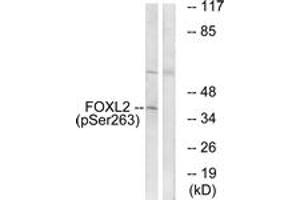 FOXL2 (Phospho-Ser263) Antibody detects endogenous levels of FOXL2 only when phosphorylated at Ser263.