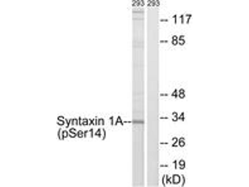 Syntaxin 1A (Phospho-Ser14) Antibody detects endogenous levels of Syntaxin 1A only when phosphorylated at Ser14.