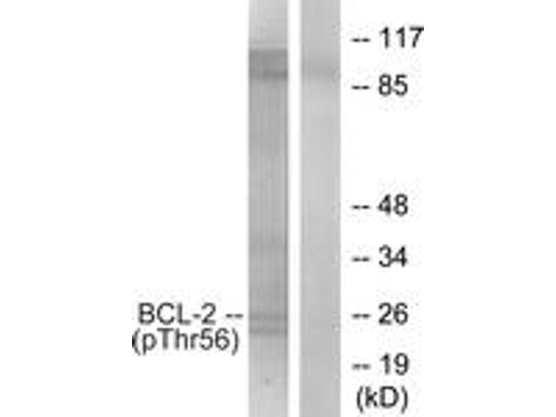 BCL-2 (Phospho-Thr56) Antibody detects endogenous levels of BCL-2 only when phosphorylated at Thr56.
