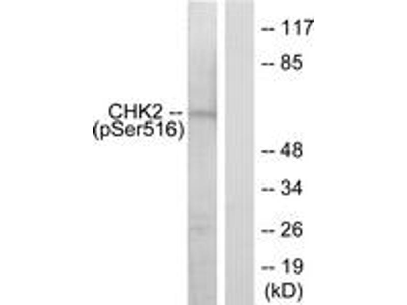 Chk2 (Phospho-Ser516) Antibody detects endogenous levels of Chk2 only when phosphorylated at Ser516.