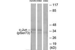 c-Jun (Phospho-Ser73) Antibody detects endogenous levels of c-Jun only when phosphorylated at Ser73.