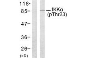 IKK-alpha (Phospho-Thr23) Antibody detects endogenous levels of IKK-alpha only when phosphorylated at Thr23.