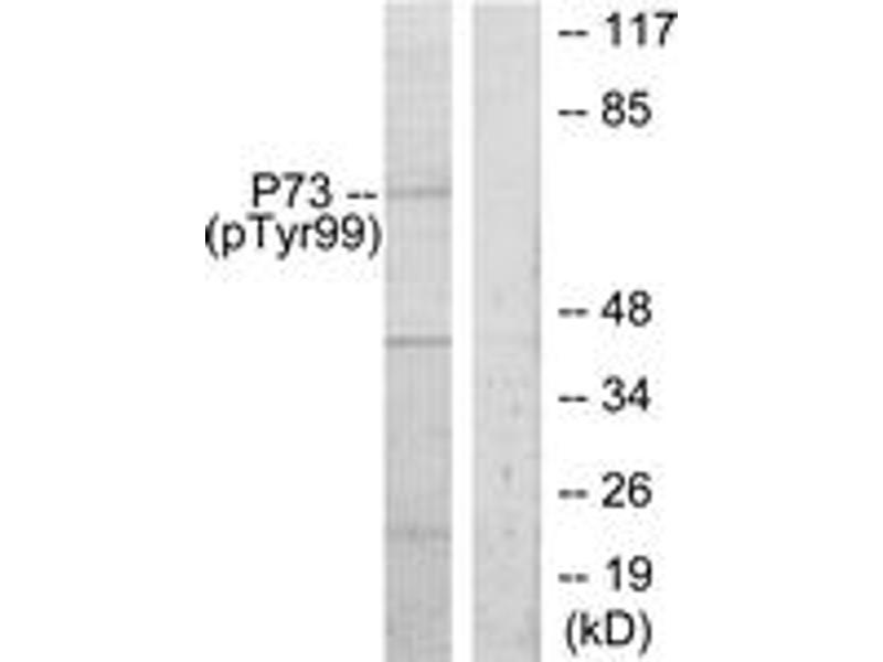 p73 (Phospho-Tyr99) Antibody detects endogenous levels of p73 only when phosphorylated at Tyr99.