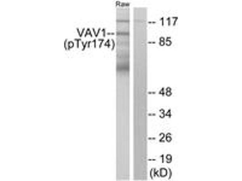 VAV1 (Phospho-Tyr174) Antibody detects endogenous levels of VAV1 only when phosphorylated at Tyr174.