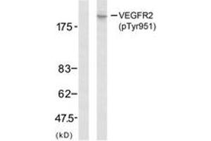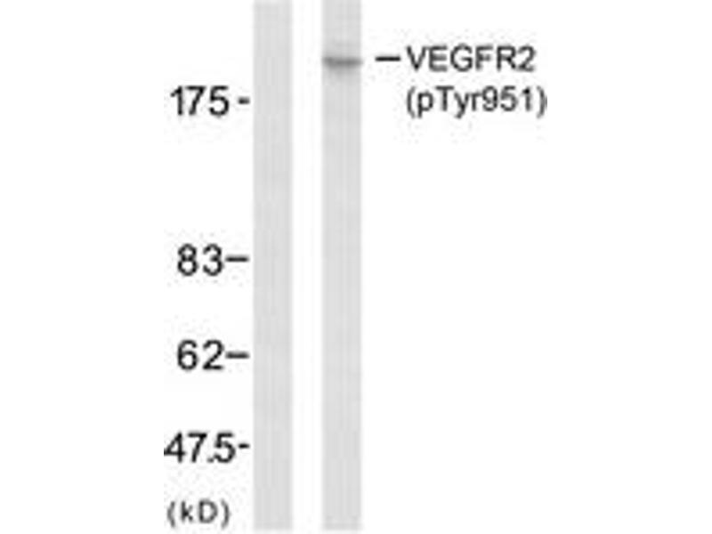 VEGFR2 (Phospho-Tyr951) Antibody detects endogenous levels of VEGFR2 only when phosphorylated at Tyr951.