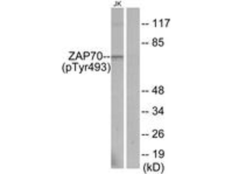 ZAP-70 (Phospho-Tyr493) Antibody detects endogenous levels of ZAP-70 only when phosphorylated at Tyr493.