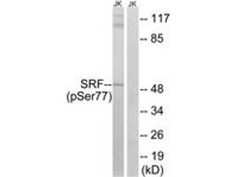 SRF (Phospho-Ser77) Antibody detects endogenous levels of SRF only when phosphorylated at Ser77.