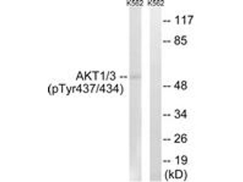 AKT1/3 (Phospho-Tyr437/434) Antibody detects endogenous levels of AKT1/3 only when phosphorylated at Tyr437/434.