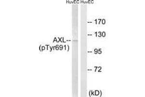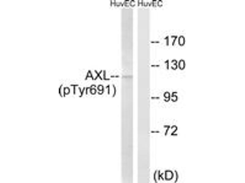 AXL (Phospho-Tyr691) Antibody detects endogenous levels of AXL only when phosphorylated at Tyr691.