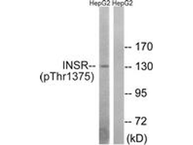 IR (Phospho-Thr1375) Antibody detects endogenous levels of IR only when phosphorylated at Thr1375.