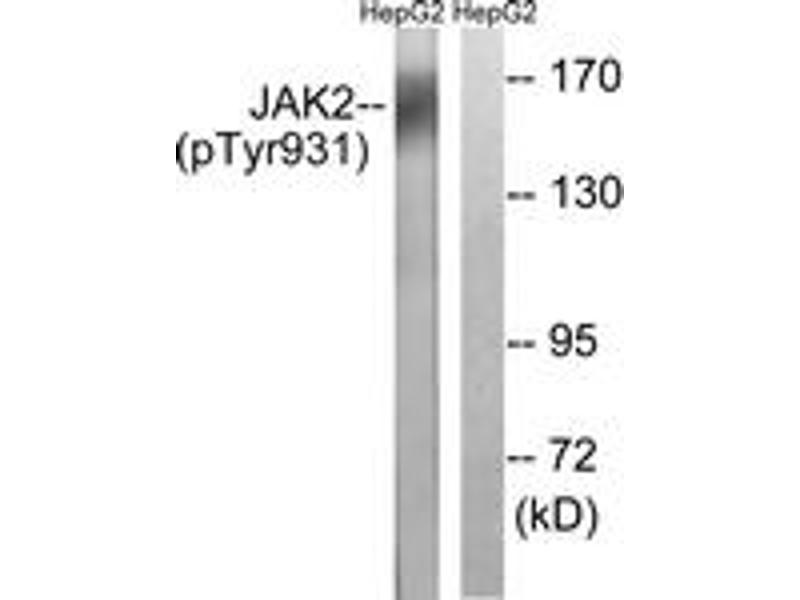 JAK2 (Phospho-Tyr931) Antibody detects endogenous levels of JAK2 only when phosphorylated at Tyr931.