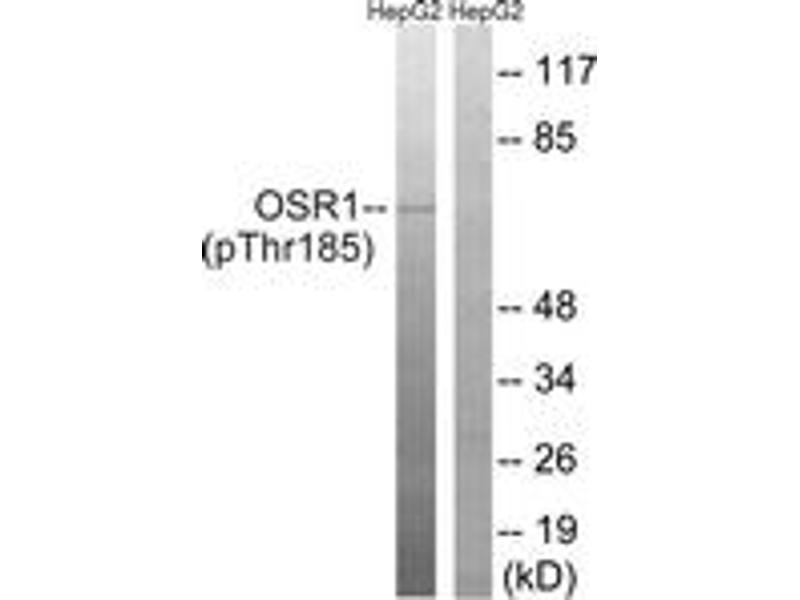 OSR1 (Phospho-Thr185) Antibody detects endogenous levels of OSR1 only when phosphorylated at Thr185.