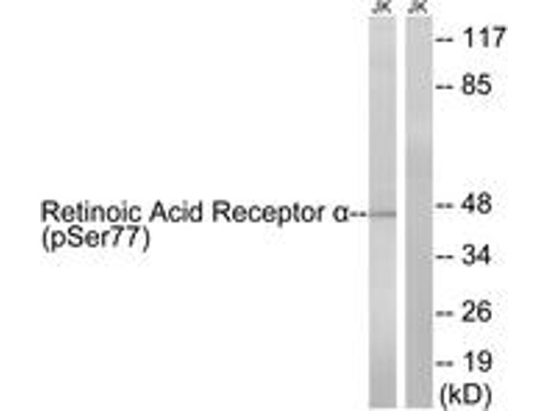 Retinoic Acid Receptor alpha (Phospho-Ser77) Antibody detects endogenous levels of Retinoic Acid Receptor alpha only when phosphorylated at Ser77.